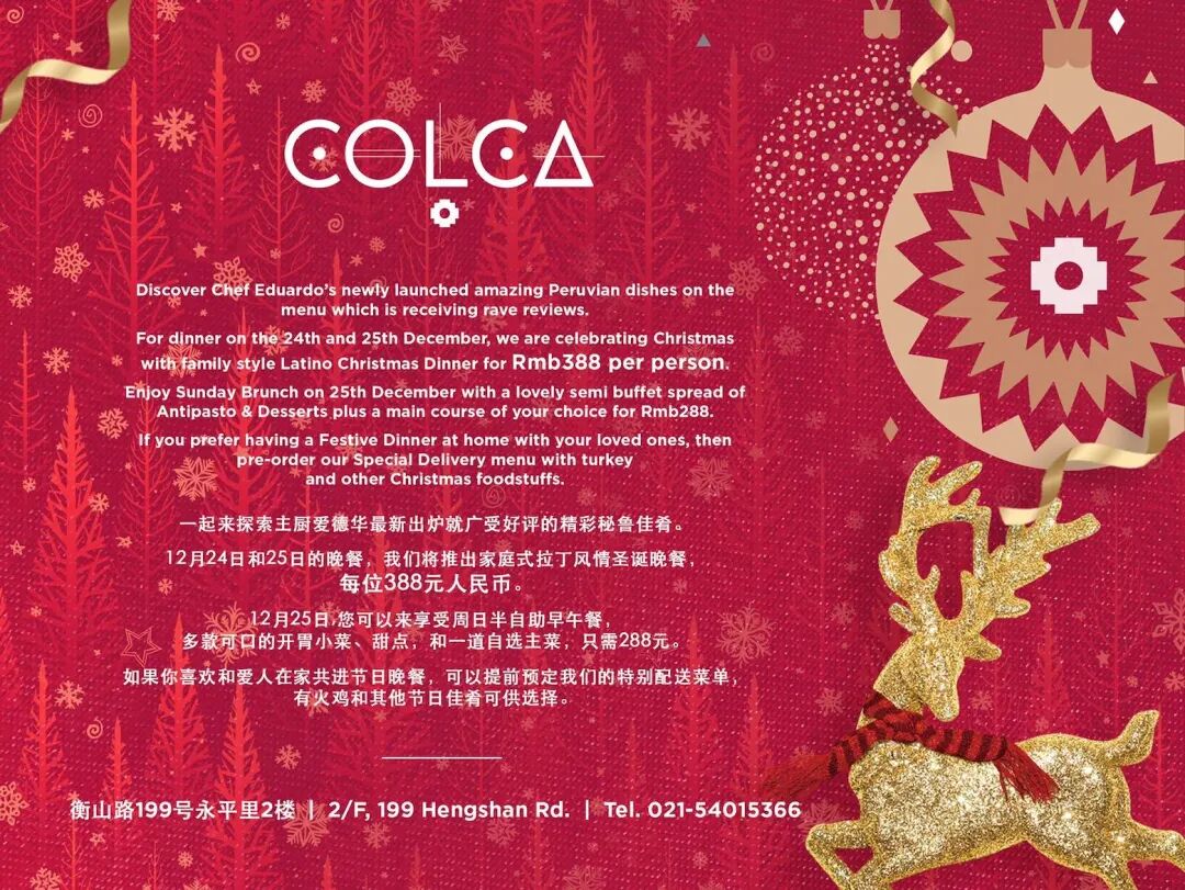 For dinner on December 24-25, Colca is celebrating Christmas with family-style Latino Christmas Dinner. Also, enjoy Sunday brunch on December 25 with a lovely semi-buffet spread of antipasto and desserts, plus a main course of your choosing.Discover Chef Eduardo's newly launched amazing Peruvian dishes on the menu that are receiving rave reviews.For those that prefer a festive dinner at home with loved ones, you can pre-order from the special delivery menu of turkey and other Christmas foods.How much? RMB388 per person for Christmas dinner, RMB288 per person for Christmas brunchColca Room 2201, 2/F, 199 Hengshan Lu, by Yongjia Lu 衡山路199号2楼2201, 近永嘉路.Cotton's