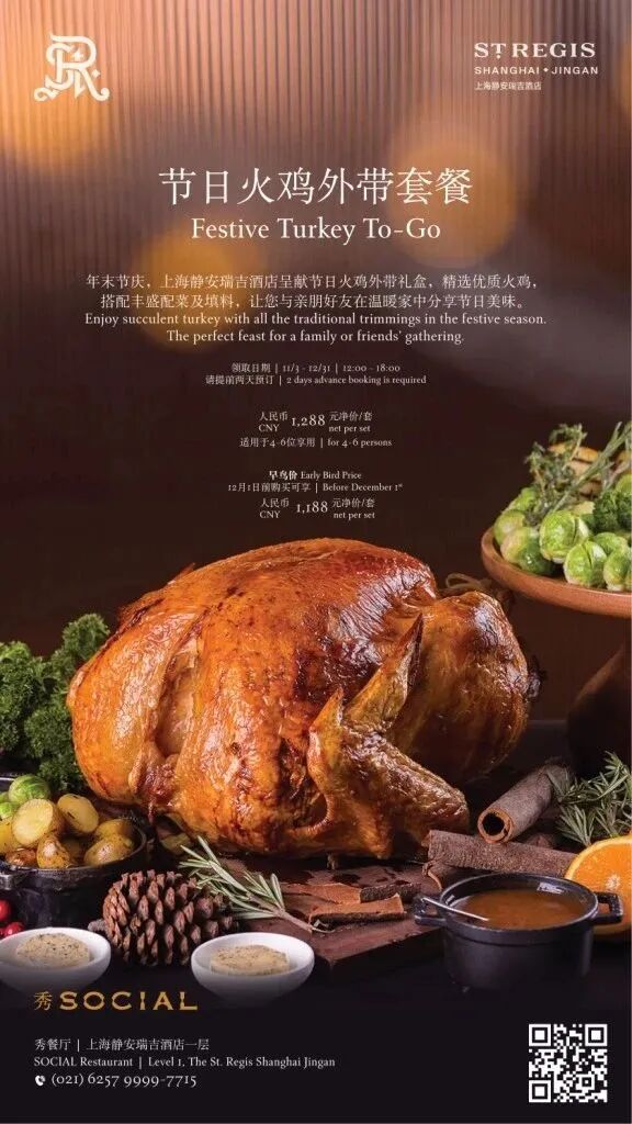 Enjoy succulent turkey with all the traditional trimmings in the festive season. The perfect feast for a family or friends’ gathering.What? A 9-10 kg turkey, traditional trimmings, for 4-6 peopleSocial 1/F, The St. Regis Shanghai Jingan, 1008 Beijing Xi Lu, by Jiangning Lu 北京西路1008号, 上海静安瑞吉酒店一层, 近江宁路.The Sukhothai, Shanghai