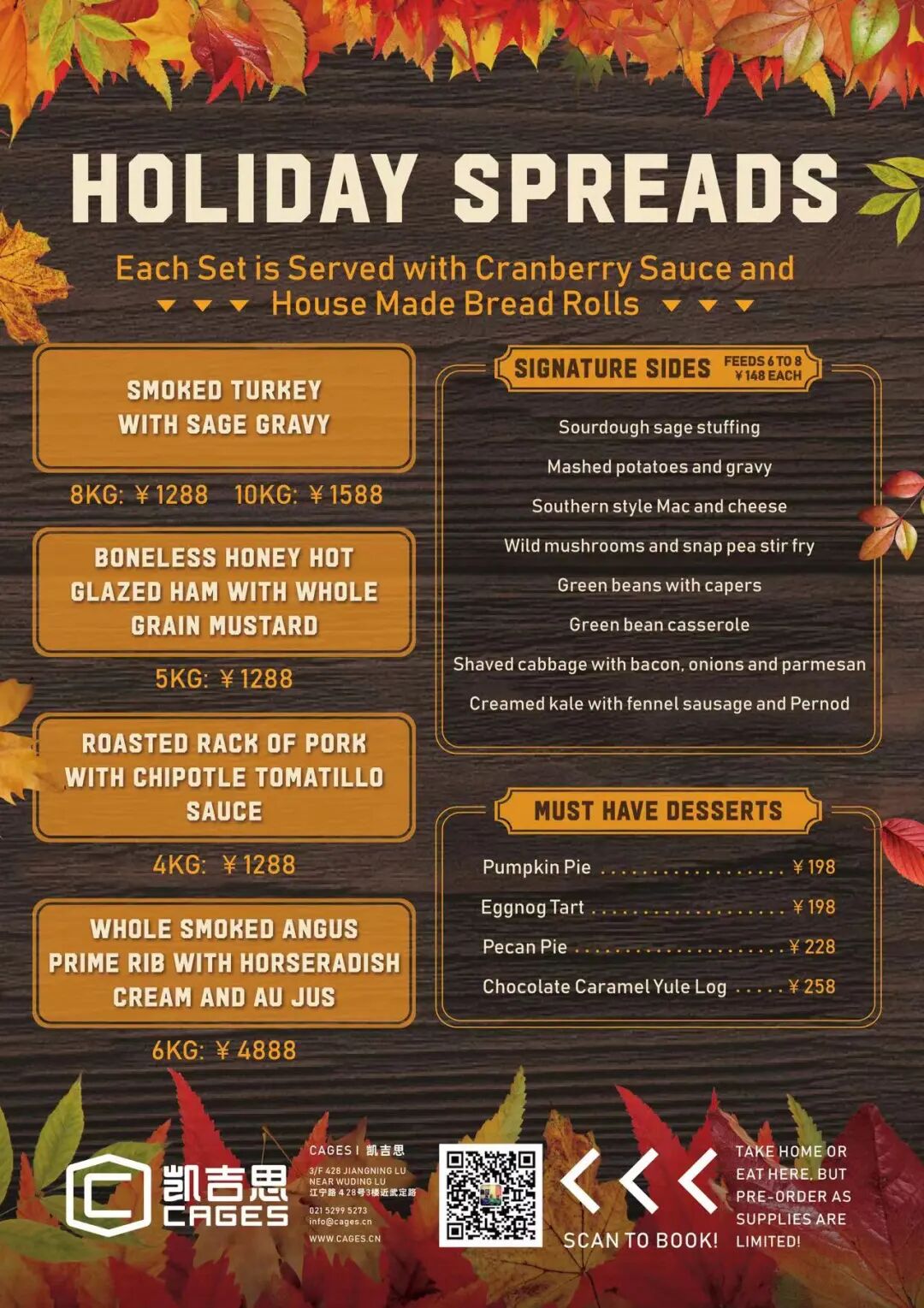 What? Check out the options aboveHow much? Spreads RMB1,288-4,888; Sides RMB148; Desserts RMB198-258Delivery? Yup, or you can pick up, or you can dine in at Cages*48 hours notice is requiredCages Jing'an3/F, Jing'an Sports Center, 428 Jiangning Lu, by Wuding Lu 江宁路428号静安体育中心3楼, 近武定路.