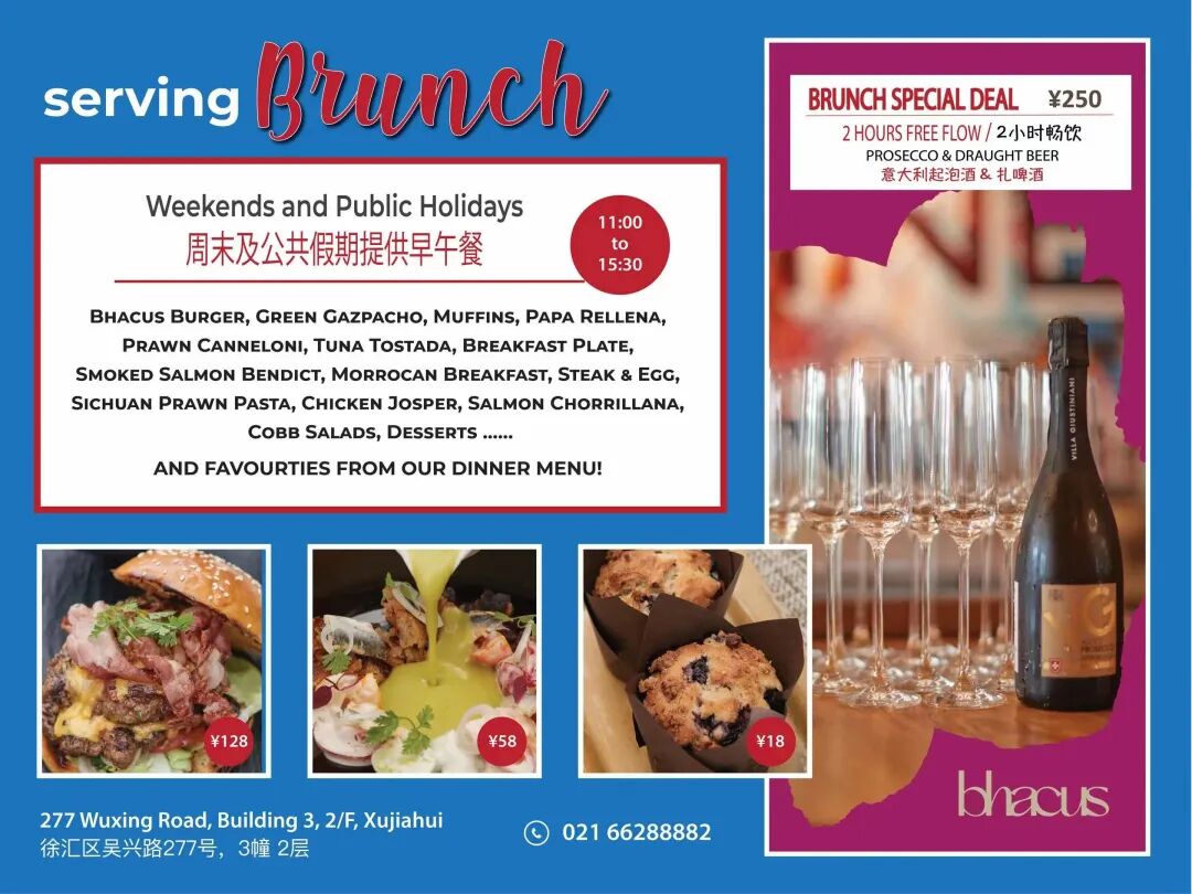 Bhacus, Eduardo Vargas and the Azul Group's latest wine and wood grill venue, has just started up a brunch (did we mention they have a huge wrap-around terrace?) with a whole load of brunch specials, favorites from the dinner menu and a two-hour free flow deal at just RMB250 – check out all the details above.bhacus2/F, 277 Wuxing Road 吴兴路277号,2楼.Colca Heng Shan