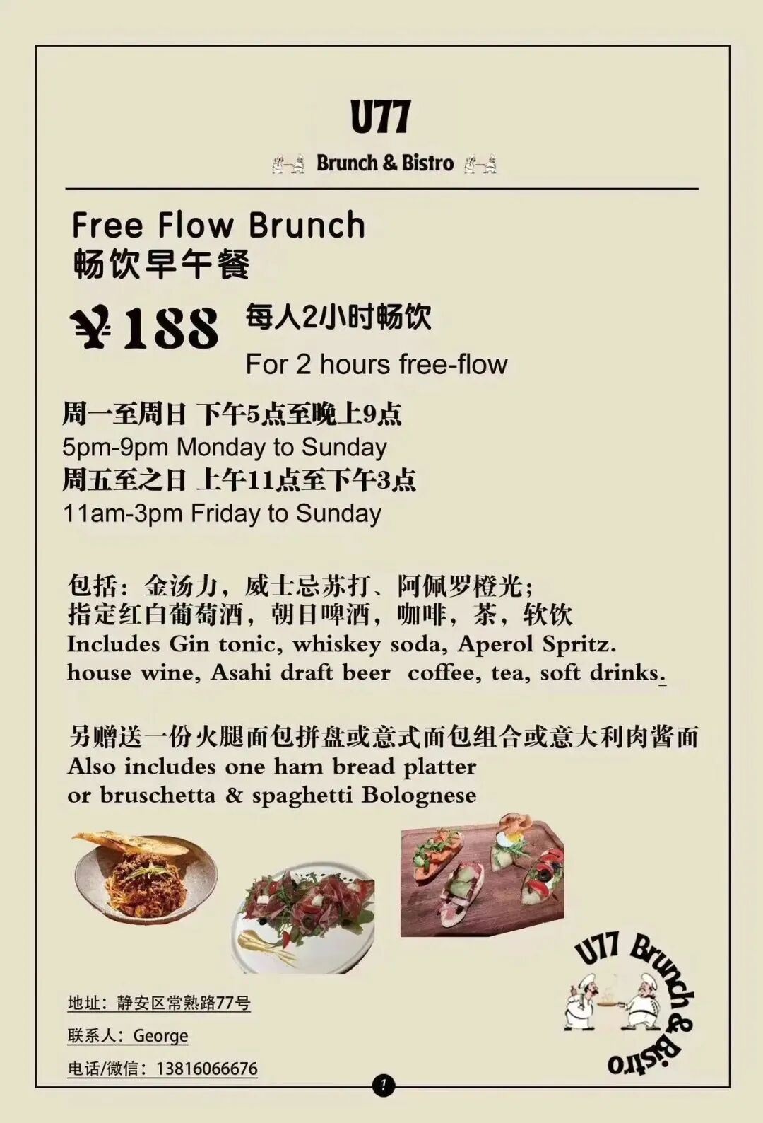 U77 Brunch & Bistro, famed for its pizza oven, juicy steaks and burgers offers a brunch with a Ham and Bread Platter or Bruschetta and Spaghetti Bolognese, washed down with two-hours free flow Gin & Tonic, Whiskey Soda, Aperol Spritz, House Wine, Asahi Draft Beer, Coffee, Tea and Soft Drinks all for just RMB188.Fri, Sat & Sun, 11am-3pm.U77 Brunch & Bistro 77 Changshu Lu, by Changle Lu, 常熟路77号,近长乐路.