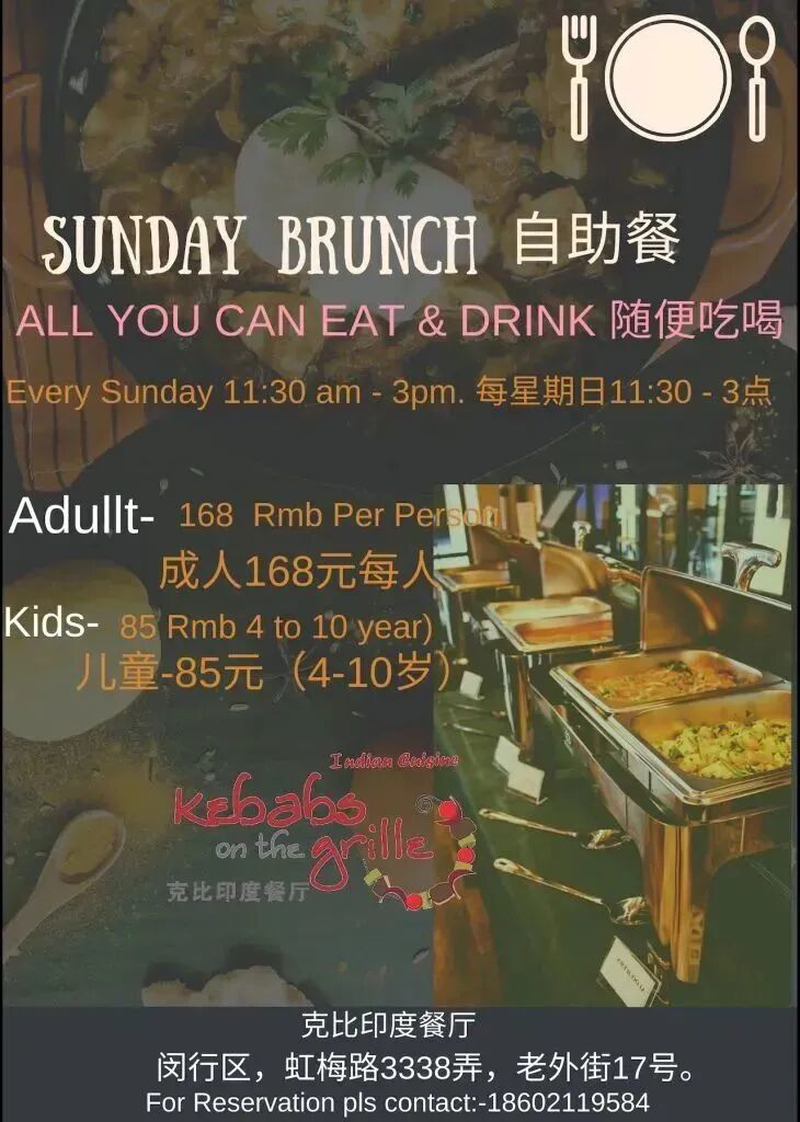 Every Sunday Kebabs on the Grille on Hongmei Lu offers up an Indian feast for just RMB168 – with free flow drinks! and alcoholic drinks! – while kids aged 10 and under eat for just RMB85.Cages
