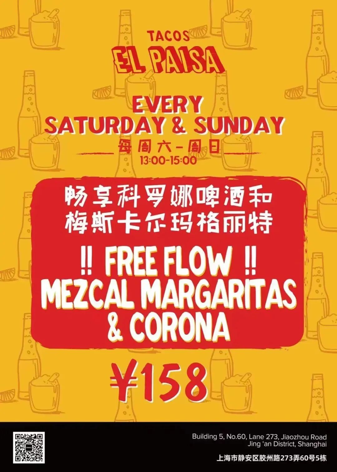 Free flow Frozen Mezcal Margaritas and Corona from 1-3pm at Tacos El Paisa every Saturday and Sunday for just RMB158. It's as simple as that!Tacos El Paisa2/F, Bldg 5, Lane 273 Jiaozhou Lu, by Xinzha Lu (enter on Yanping Lu or Jiaozhou Lu) 胶州路273弄60号5幢2楼,近新闸路.Tacolicious