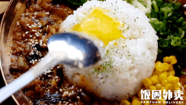 米饭的余温将溏心蛋弄的刚好成熟,用勺子戳开搅拌在一起,吃完就上瘾!