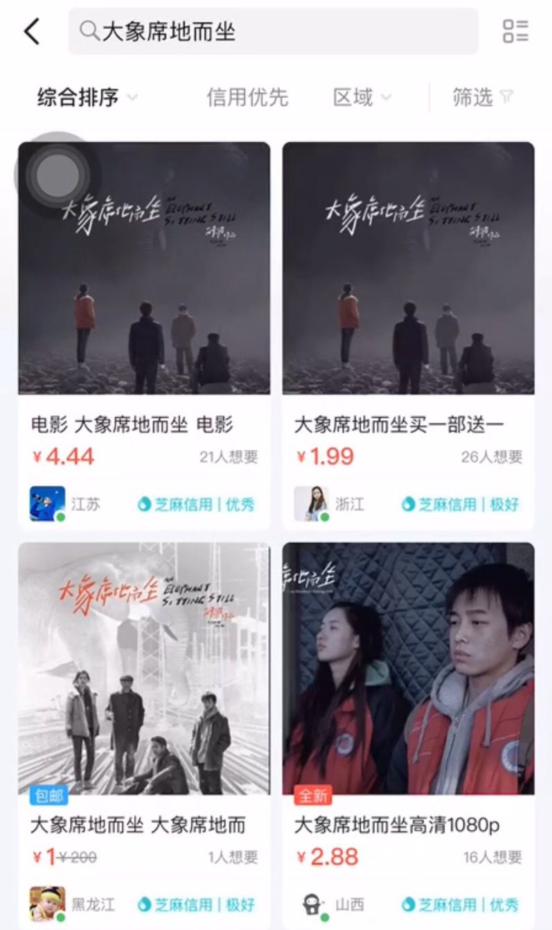 因为我看到《大象》的资源被明码标价的放在某些平台上,一块,两块,那廉价的像是一个泔水满地的菜市场。