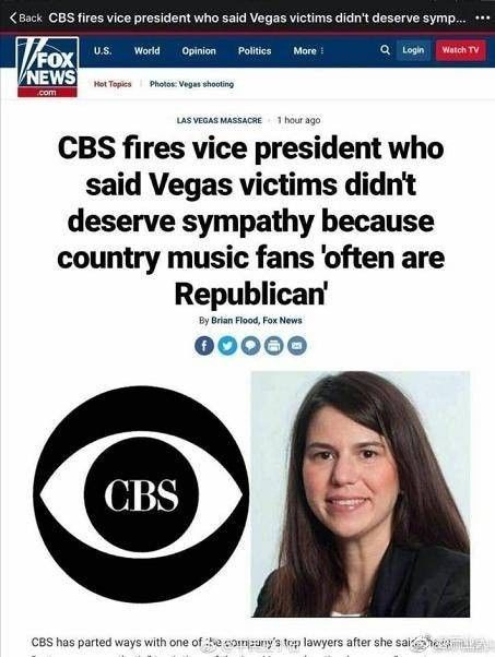 美国这次枪击事件之后,有一件事,我就觉得很值得中国学习借鉴。美国哥伦比亚广播公司CBS的高级副总裁在惨案之后,在社交媒体上发文说,这些人不值得同情,因为喜欢乡村音乐的,多是共和党人。哥伦比亚广播公司第一时间开除了他。这说明美国的主流媒体多么讲政治,对于挑战自己政治正确的人,敢于下手,决不允许美国公知端体制的饭碗。中国在这方面,就很需要反思。有那么多挑战中国政治底线和道德底线的人,还安然无恙的端着体制的饭碗。支持台独的,在中国圈钱,除了网友呼吁,也没有部门出来出个禁止性规定。该处理的不敢处理,除了内部有同情者的因素之外,更多还是不自信的心理作怪。怕处理了,会被人批为侵害言论自由,担心被贴上文革标签。