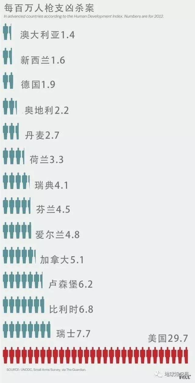 另外,美国的每百万人枪支凶杀率为29.7,不用说比中国,比其他发达国家都高很多。