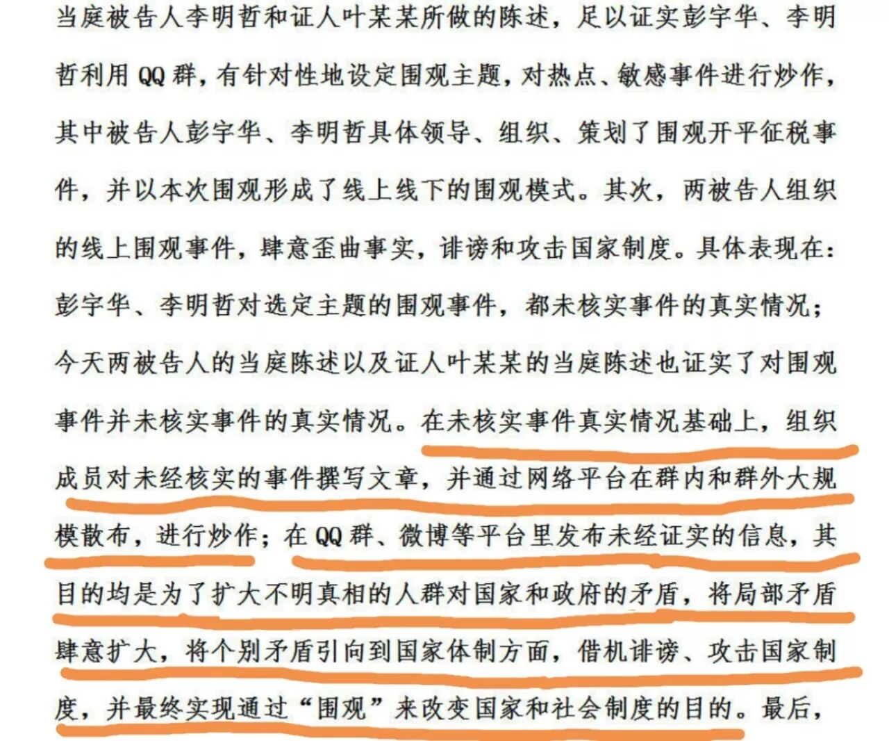 比如:“在未核实事件真实情况基础上,组织成员对未经核实的事件撰写文章,并通过网络平台在群内和群外大规模散步,进行炒作...其目的均是为了扩大不明真相的人群对国家和政府的矛盾,将局部矛盾肆意扩大,将个别矛盾引向国家体制方面,阶级诽谤、攻击国家制度,并最终实现通过‘围观’来改变国家和社会制度的目的”。