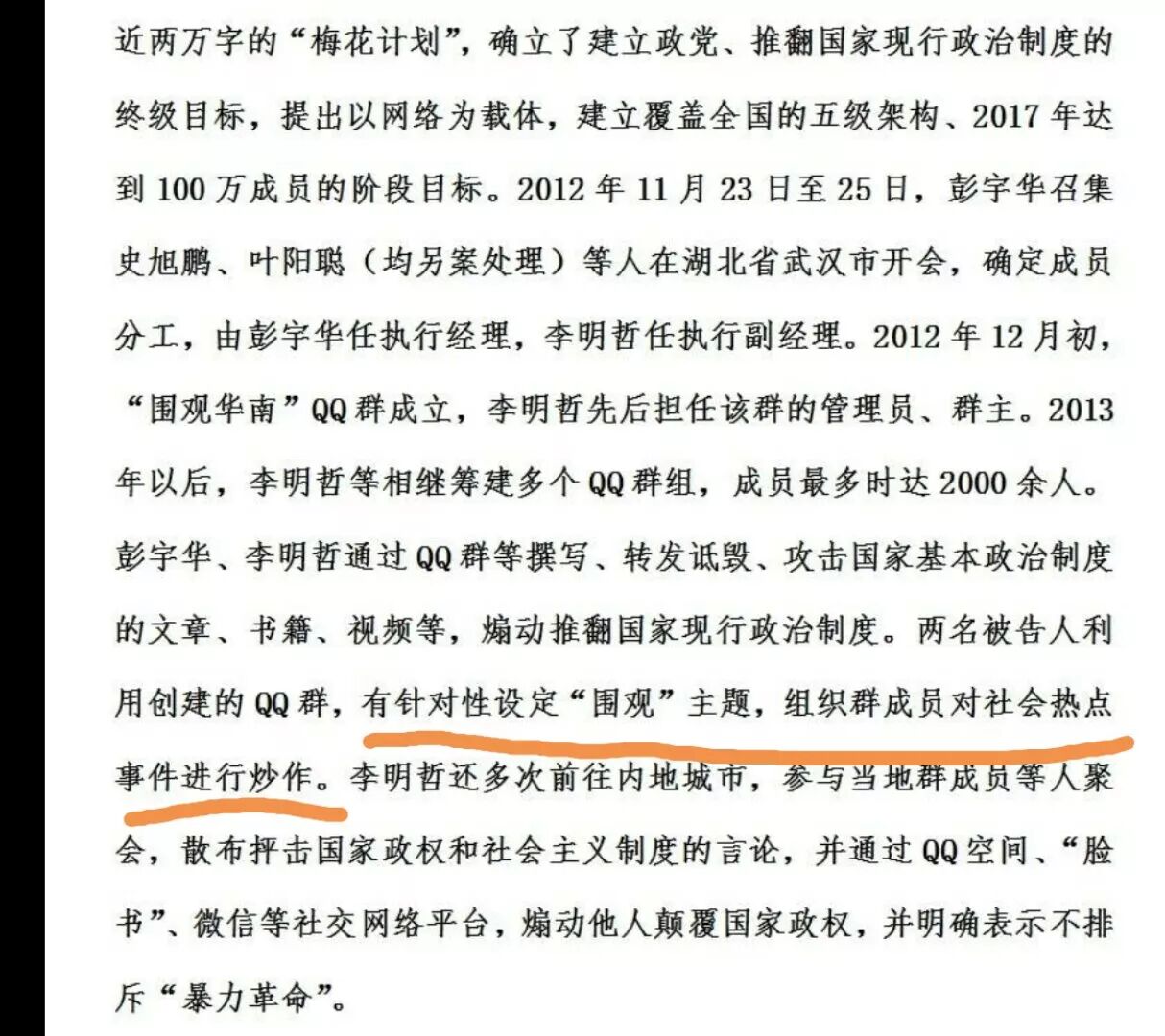 彭宇华2012年5月在湖南长沙创建“两岸牵手”QQ群,宣扬颠覆国家政权思想,同年9月李明哲加入并承担重要角色。同年11月,群组更名为“围观中国”,并制订所谓“梅花计划”,成立了“梅花公司”,确立建立政党、推翻现行政治制度等终极目标。