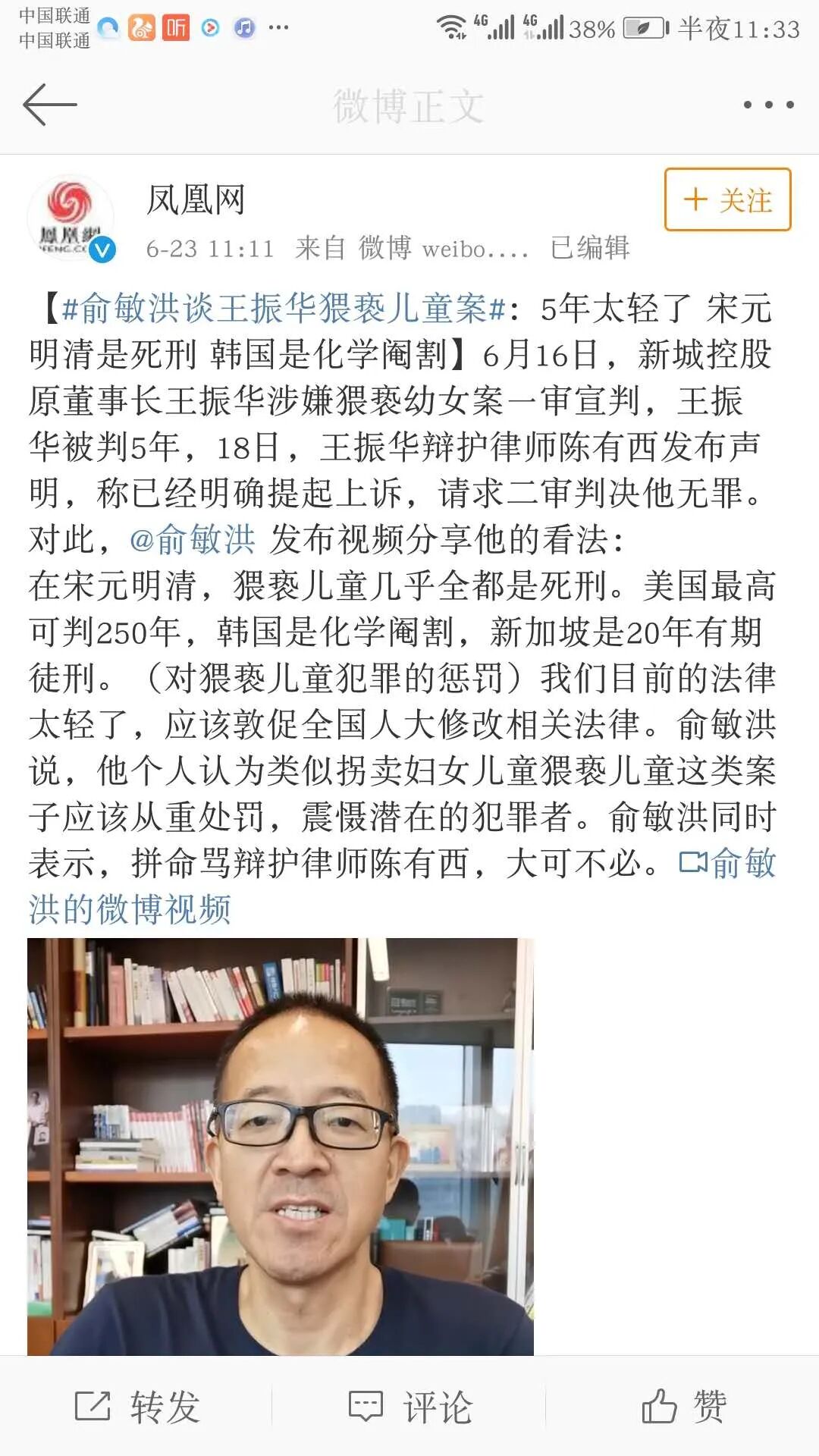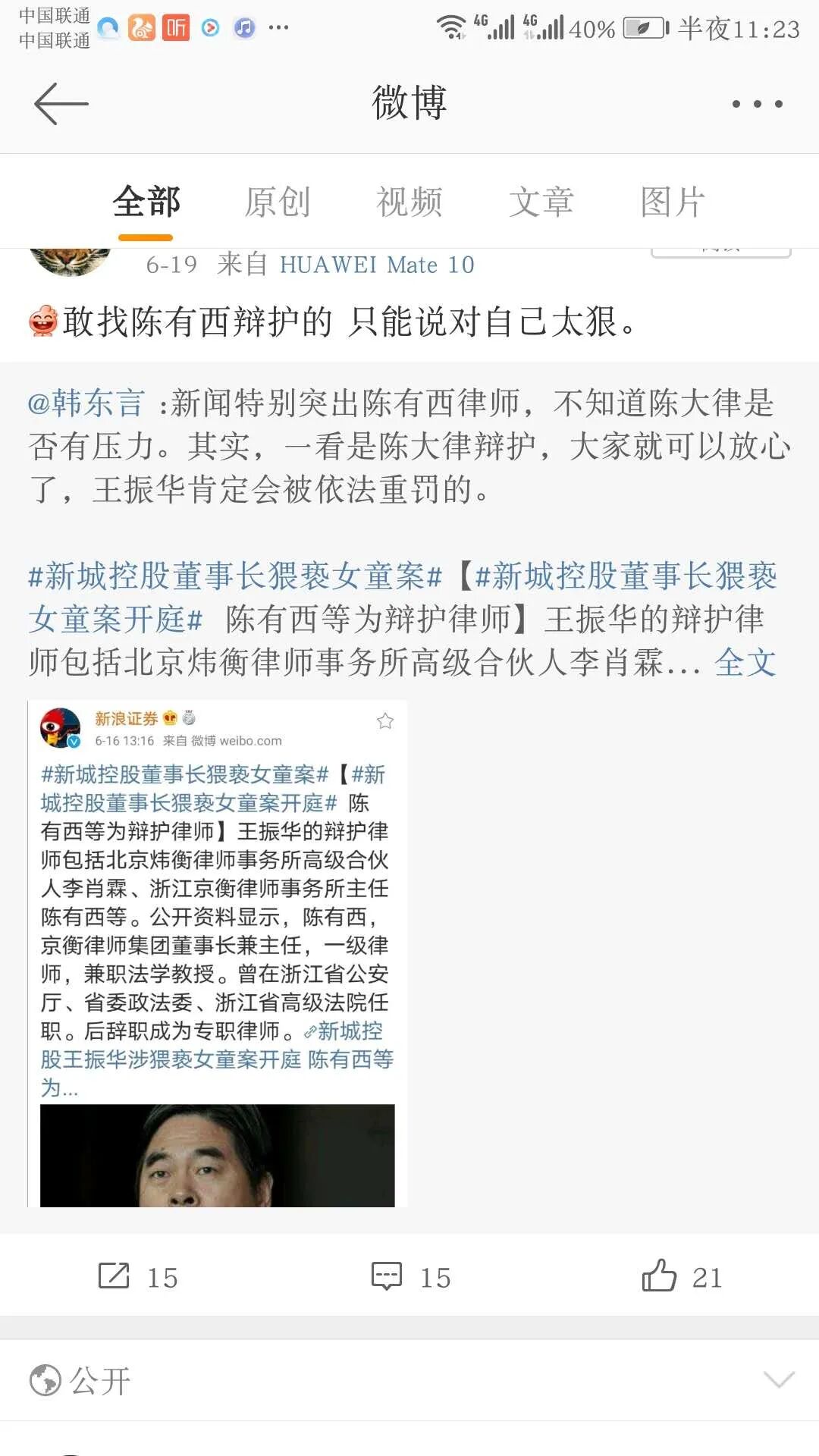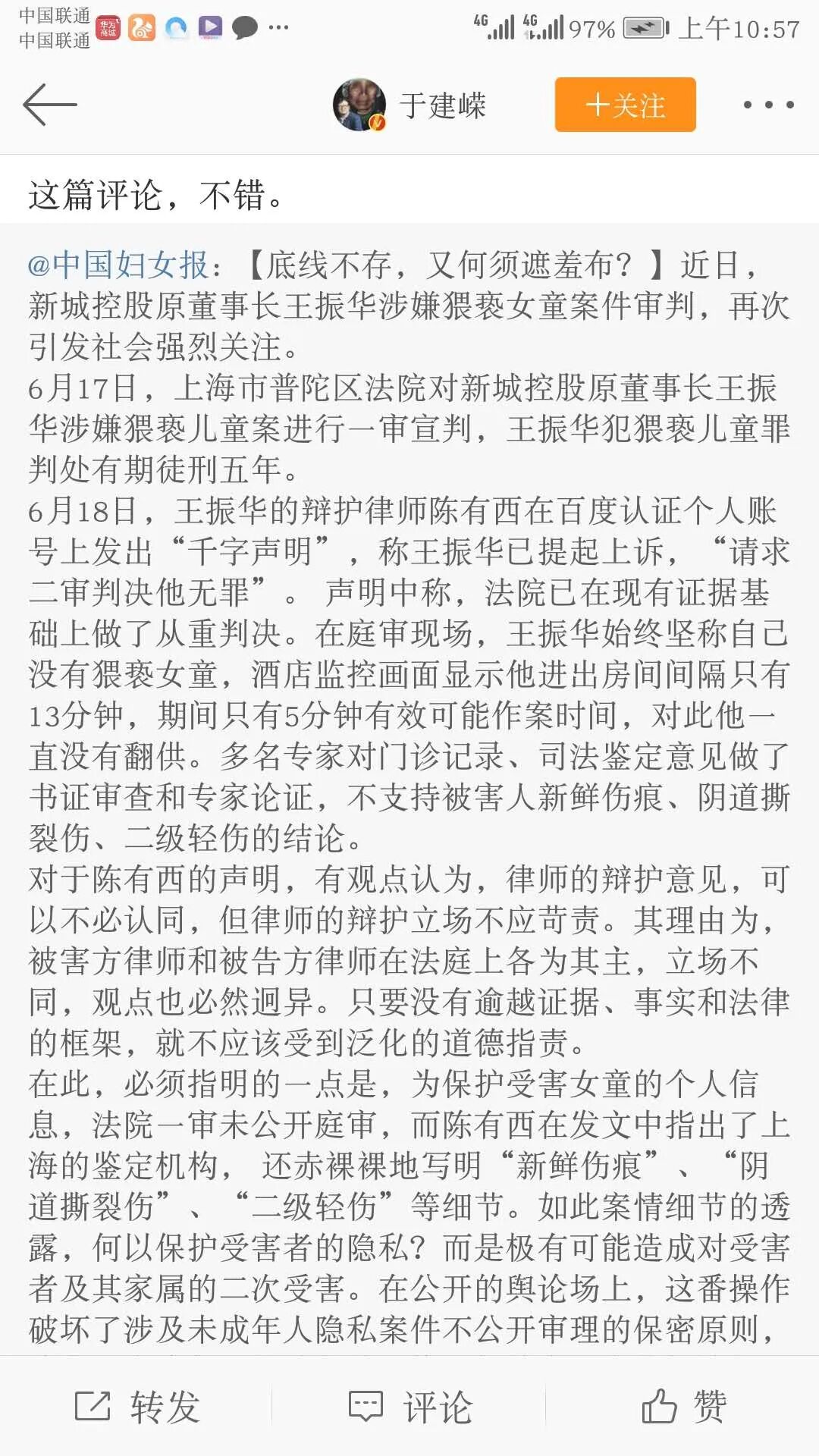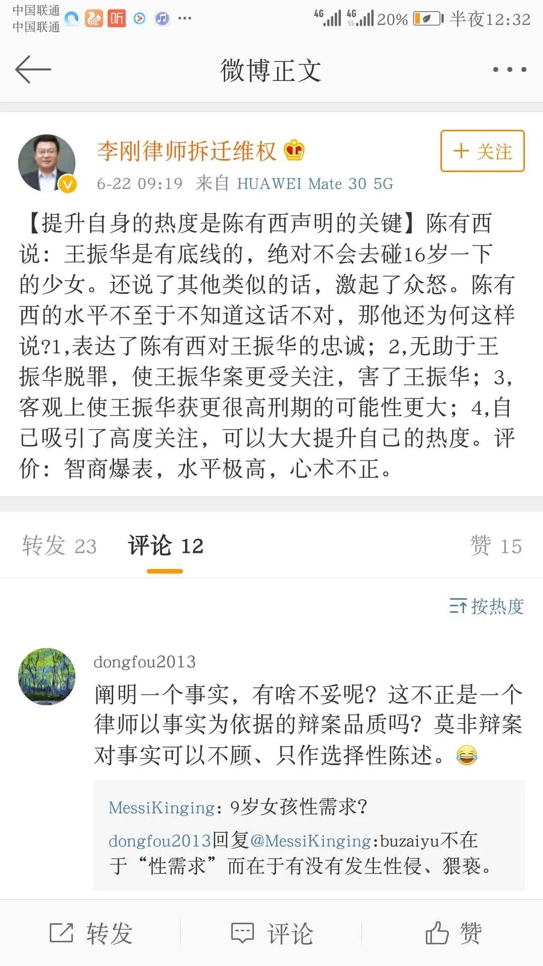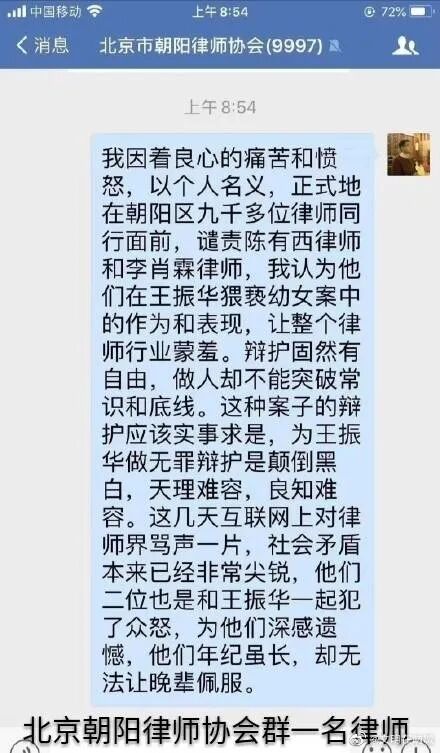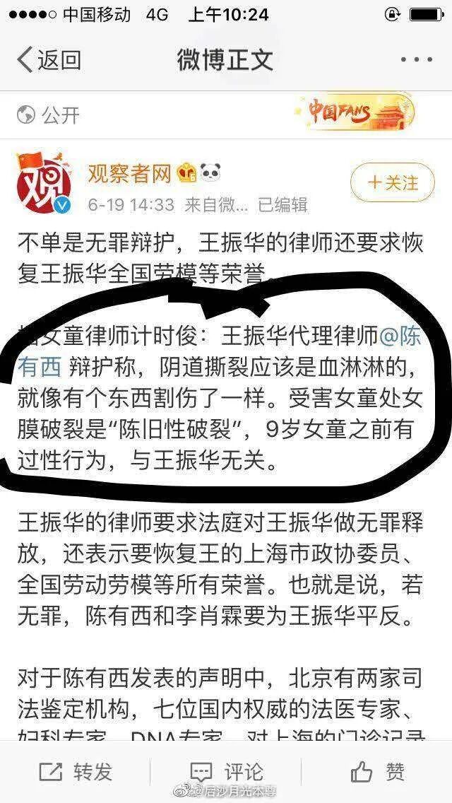 这样的辩护意见,只会引发公众更大的愤怒,让王振华变得民愤更大。所以滥用无罪辩护,非但无效,反而对当事人有害。当然王振华选择陈有西做辩护,我是大大支持的,因为这有利于王振华得到重判。如果陈有西低调一点,继续走二审程序,根据上诉不加刑的原则,王振华的刑期最多还是五年;但经过陈有西这样的骚操作,我认为王振华被抗诉重判的可能性大增。今天看到,连新东方的俞敏洪都出来说这个案子判轻了,进入核心资本圈的资本家都开始出来与王振华做切割,应该是担心这个案子会引发社会公众对资本家群体的负面评价。美国的资本大鳄猥亵和强奸儿童,正在被揭开冰山一角。在中国,王振华是不是仅是个案?俞敏洪的表态显然是希望公众这样认为。至于无罪,原本可能性就是零。现在被陈有西一顿骚操作,搞成了负无穷大。不过,王振华和陈有西,还真是绝配。上海高院方面说,王振华到案后及庭审中拒不供认其猥亵的犯罪事实,辩护人和被告人配合堪称默契。但这样的默契有用吗?一审仅判决五年,已经让全社会哗然,但陈有西还给王振华画了一个无罪的幻景,让王振华水中捞月。过去一些受到严惩的罪犯,在他们的判决文书里,一般都有两句话,“情节特别严重”“社会影响极其恶劣”。法律追求法律效果和社会效果的统一,经过陈有西的骚操作,王振华已经到了民愤极大,不重判不足以平民愤的程度,不重判就违背了法律效果和社会效果相统一的要求。陈有西发声明,本来是想利用舆论,给王振华创造二审无罪的舆论环境,但他错估了形势,还以为是公知话语权独大,反体制就可以得到呼应的时代。王振华这样的人就需要陈有西这样的人来挖个大坑,但因此产生的效果还不止于此,陈有西的手段让昔日的公知队友也在跟他保持距离,连于建嵘都看不下去了。![]()