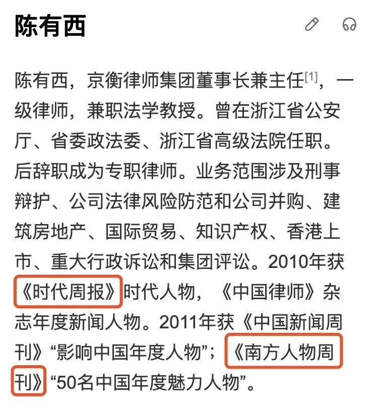水平这样凹,是怎么成为国内特别有名气的雄辩大律师呢?这里面既有中国律师行业的特殊环境问题,也有陈有西的个人特长。看陈有西的经历,他原来是在体制内给浙江省政法委的领导当过秘书,据他自称“‘我那时是浙江司法界的实权派人物,已经在核心层了’。陈有西说,他下定决心,如果40岁之前当不上厅级干部,就不干了。”(南风窗:《大律师陈有西》)。“省委管政法的书记下面就是秘书,虽然我没有实权,但我作为一个秘书,厅长汇报工作先要通过我才能见到书记”。后来陈有西离开体制,成立律师所。曾经是“浙江司法界的实权派人物”的陈有西,人脉资源应该有大把。他自己都说:“我和浙江公安的关系一直不错,又是浙江警察学院的兼职教授,警察局长、刑警队长、看守所长多少和我都有师生之分。”人脉可以让一个业务并不突出的律师很快在律师圈崛起。陈有西多次被杭州司法局评为优秀党员,也就不奇怪了。但要成为全国范围内的名律师,光靠陈有西在地方积累的那点人脉还是不够的,还要有足够的舆论曝光度。陈有西最擅长的是舆论操作,他的名气与他在网络上的“耕耘”是分不开的。他善于用“舆论影响司法”。“制造压力、公开庭审,这是他将案件公布天下的主要意图。”(南风窗:大律师陈有西)“我们的律师必须要依靠媒体的公开,媒体是我们天然的同盟军”、“如果一个律师远离媒体,你成不了大律师,成不了名律师。”(陈有西:在上海律师协会的演讲)……陈有西的名声鹊起,是在前几年公知的高光时段实现的。有那么一段时间,反体制可以得到网络话语权的支持,迅速实现知名度的跃迁。前几年的“死磕”律师,名声大作,陈有西就是从“死磕”获得名气加持,并受益最大的“死磕派”律师之一。“死磕派”有一个共同特点:反中国体制。他们特别向往西方的司法体制,特别是美国的。美国的律师不但创造了万亿美元GDP,而且按陈有西自己的说法,美国的总统一半是律师,国会议员三分之一是律师,中国的“死磕派”律师也有一个“总统梦”、“议员梦”。“死磕派”把具体的个案跟中国的体制联系在一起,案件遇到问题,就把原因归结到中国的体制。陈有西那么多案子结果不忍直视,我可没见他反思过自己的代理方案和专业能力,我都怀疑陈有西是不是在当事人那里把自己辩护的失败也说成是中国体制造成的。陈有西对自己的定位可不一般。“陈有西从不认为自己是个商业律师,而是把自己定位于政治律师”、“‘身在朝野,心在汉阙’。陈自称‘心忧天下,心忧政权,开明政权怎么建设我是有一套非常清晰的思路的’,因此,他更乐于在个人博客等平台发表对全国事件的看法,以及对制度的理解。”“陈有西已经到过全国十几个省市演讲,他的目标是走遍全国。”(南都周刊:【大牌律师转型】李庄案后的律师暗战)陈有西对中国体制的否定不逊于北大的那个贺,2015年前后,陈有西曾经在一篇文章的“编者按”里,给新中国的体制加上了原罪:“我们的制度设计有那么多的原罪”。陈有西一边反对追究资本原罪,一边给新中国的制度加了一个“原罪”。“我们国家现在暴发出来的大量问题,都在于基础制度设计上的先天病灶”。在陈有西眼里,非但新中国什么是都错的,而且连近现代史上推动历史前进的事件都是错的,连抗日都是错的:“错、错、错!1.朝鲜战争打错了,不该打;2.对越战争打错了;3.解放战争(国共战争)打错了,千万军民的死亡,换来公有制的社会主义,原来却没有道理,被改革开放否定了;4.抗日战争,不打又如何?让日本人管理中国,满族人入主中原,中华文明依旧,满族没有了;日本和族未必不是这个下场;5.土地战争,打土豪分田地,有什么道理?符合什么原理?什么法理?6.辛亥革命,不革又如何?君主立宪,未尝不可。苦难深重的中国啊,一直在错、错、错!仍然错、继续错、尤其错!”陈有西对台独的吹捧也是令人瞠目:“蔡英文本来就是、从骨子里自认是中国人,是中华民族和中华文明的传人。继承了中华文化的源流。不要受一些批台独宣传的误导”。他也和那些从反体制走到反中华民族的人一样:“这个国家的人种不好,没有膝盖的人太多”。对中华文化那是各种看不惯,连中国的一些民间传说都被他阶级化处理,大加批判:“牛郎织女、天仙配、追魚、田螺姑娘等好多美丽的民间传说,是穷光蛋做白日梦,浸透了不思自强、怨天尤人、不劳而获、一夜暴富的流氓无产者的愚昧毒素”看看陈有西的上述言论,是不是至少是方方+梁艳萍的组合?陈有西的三观和前几年掌握中国话语权的自由派(背后是买办资本)的政治诉求不谋而合,所以就如陈有西所说,媒体成了他“天然的同盟军”。当然,差不多是同样的那些媒体也后来也跟支持陈有西一样,力挺过方方。![]()