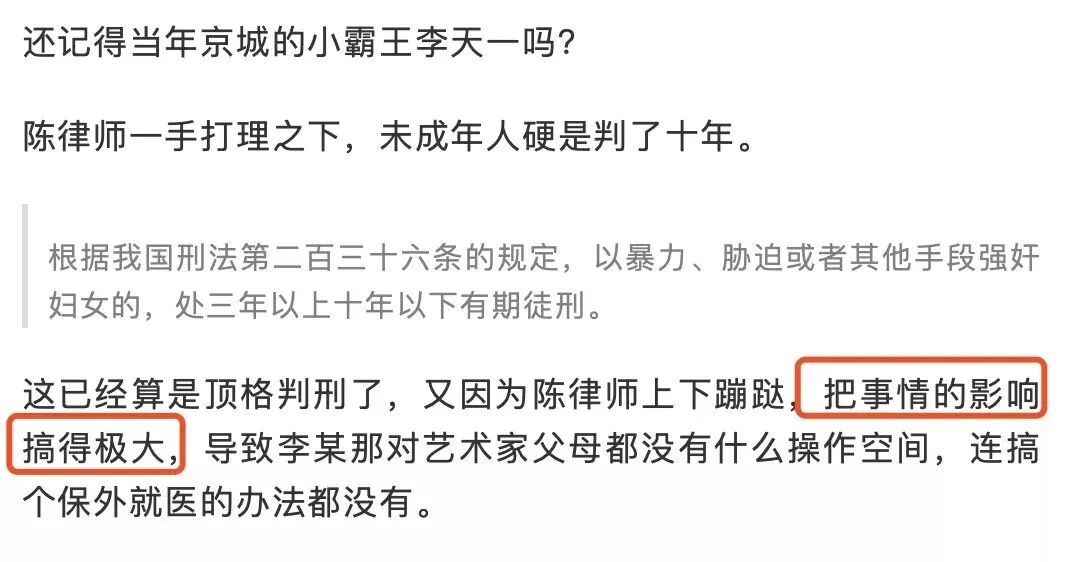 因为陈有西的表演越充分,王振华得到严惩的概率就越高。微博网友早就给出预测:一看陈大律辩护,大家就可以放心了,王振华肯定会被依法重罚的。对陈有西的“信心”来自他以往给被告人辩护的成绩单。陈有西经常给被告人做无罪辩护,但经常把当事人辩成重判。夏俊峰,被他用无罪辩护辩成了死刑。李天一,一个未成年人,被他的无罪辩护辩成了十年的重判.....![]()