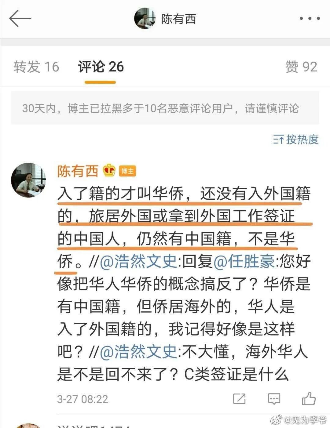 还有一次,他不懂装懂的给人解释什么是华侨,给出的是明显错误的答案,却丝毫不耽误他好为人师。![]()