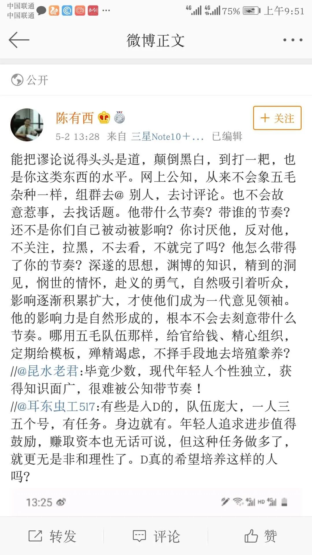 陈有西这种自我感觉良好的特点和方方很像。方方也很喜欢攻击反对他的网友低智商,但自己却时不时搞个一般人都不会犯的低级错误。比如,前几天,方方点赞了一个嘲笑她的评论,原因是她可能只看了前面十个字,就以为是支持她迫不及待的点了赞。![]()