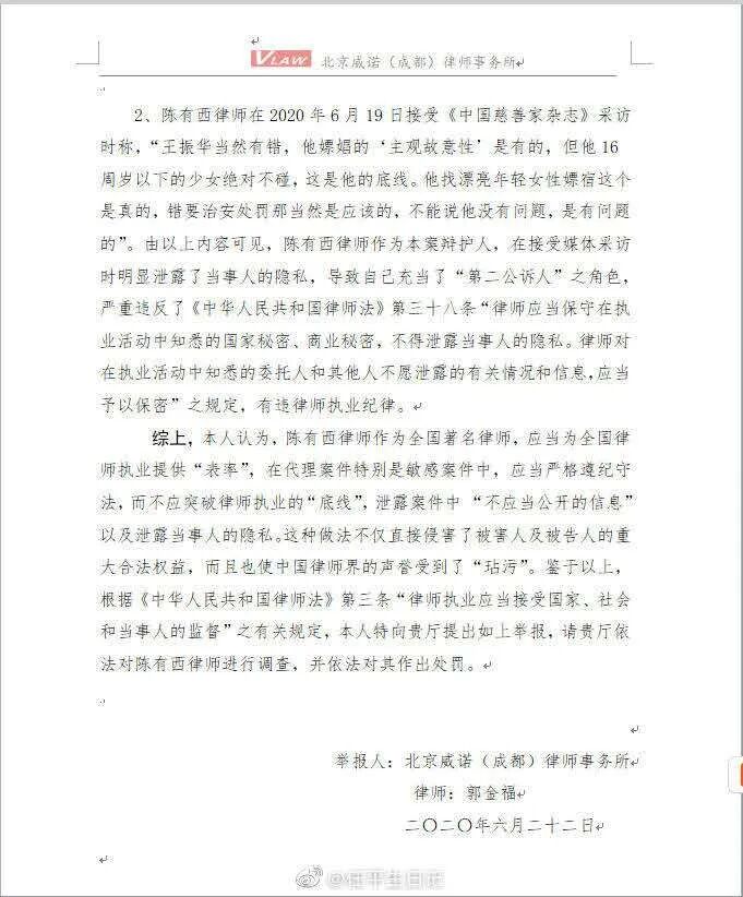 这涉及到律师进行辩护时,要不要遵守基本的伦理道德?看到一句话我特别赞成:能够把白的还原成白的是优秀律师,能够把黑的说成白的是优秀讼师。陈有西是想做哪一个?这一次陈有西为了王振华的无罪辩护,很可能把他自己也埋进去。刑法308条“泄露不应公开的案件信息罪”:司法工作人员、辩护人、诉讼代理人或者其他诉讼参与人,泄露依法不公开审理的案件中不应当公开的信息,造成信息公开传播或者其他严重后果的,处三年以下有期徒刑、拘役或者管制,并处或者单处罚金。陈有西是不是违法还不能下结论,但已经有律师同行举报他违规了。![]()