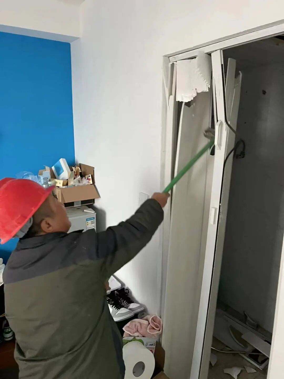 家住三新路5弄15号301室的张先生,因楼上群租房房客过多,长期以来一直忍受夜间的扰民声响,同时群租房里在客厅中安装的卫浴设施也让他不堪其扰,于是向居委和信访办投诉群租相关情况。接到投诉后,镇群租整治办立即联系属地居委核实情况。三林老街居委上门查看后确认房屋厅里加装卫生间,同时擅自加装排污管道,属于群租房。随后居委张贴《责令限期整改告知书》,要求二房东在7日内进行自行整改,如逾期未自行整改,镇群租整治办将联合派出所、城管、房办、居委、物业等上门开展联合整治。7日后该房屋仍未进行自行整改,镇群租整治办立即联合相关职能部门对该处群租房进行联合整治,对违规安装的马桶、热水器、台盆、玻璃门等相关设施进行拆除。