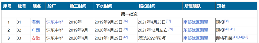 我们的055大型驱逐舰是世界一流水平,但首艘舰南昌舰是在2020年1月举行的海军归建入列仪式,到今天也就是两年多的时间,下图来自维基百科上网友整理,可以看出现役的6艘055驱逐舰有5艘是2021-2022年服役的,从时间上看,这6艘里面肯定有的还没有形成战斗力。