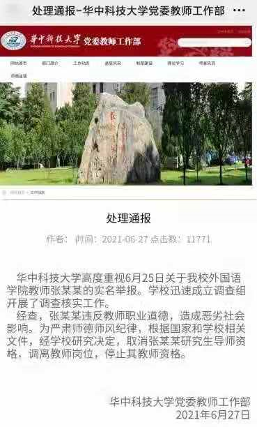 先给昨天的公号文章《女研究生实名举报华中科技大学教授性骚扰》追个踪,最新进展如下图,为华中科技大学调查处理的速度点个赞。