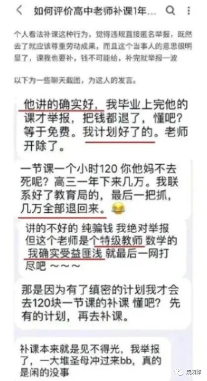 这名学生接着又自曝,“高三一年下来几万,我联系好了教育局的,最后一把抓,几万全部退回来” 。他还承认, “我确实受益匪浅”,“那是因为有了缜密的计划我才会去120块一节课的补课,懂吧?先有的计划,再去补课”。