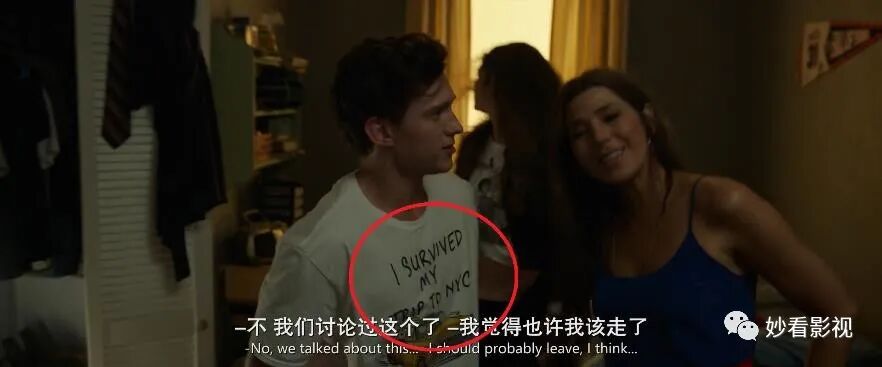 5.彼得和MJ回到公寓后穿的T恤写着“我在纽约之旅中幸存了下来”。