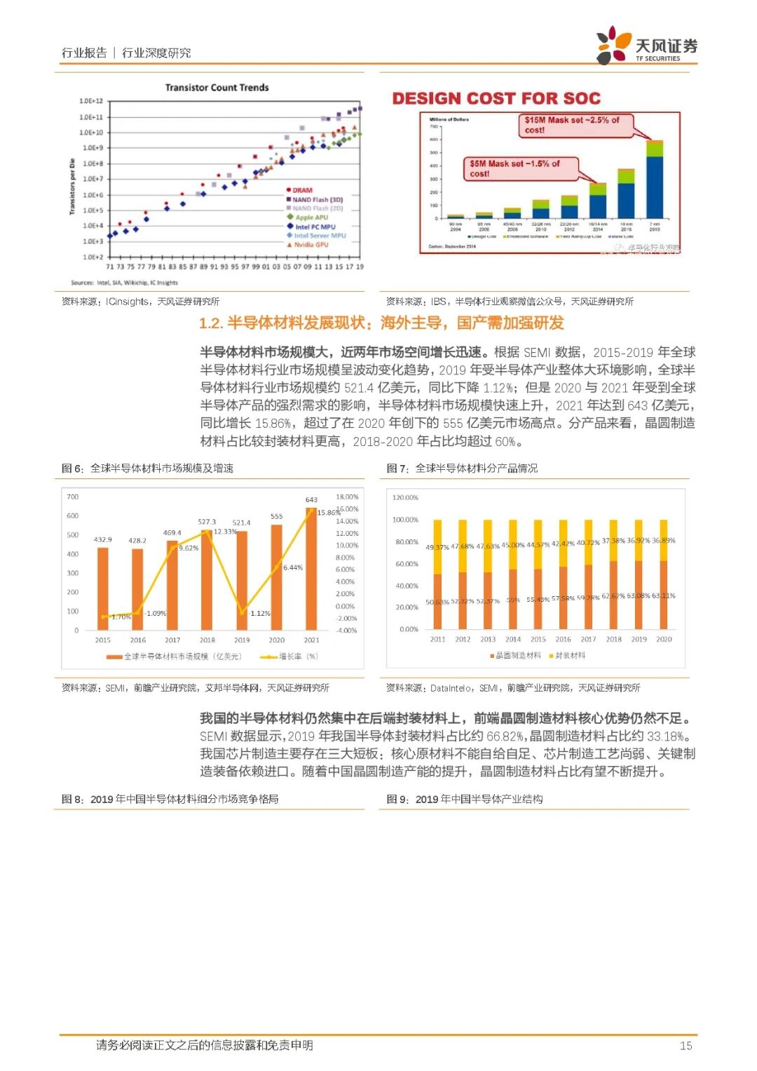 半导体材料和设备是半导体制造工艺的基石,制程的进步推动半导体材料价值量增加,需求相应进一步提升。市场规模增长迅速,2021年达到643亿美元,同比增长15.86%。分产品来看,晶圆制造材料占比较封装材料更高,2018-2020年占比均超过60%。我国的半导体材料仍然集中在后端封装材料上,前端晶圆制造材料核心优势仍然不足,随着中国晶圆制造产能的提升,晶圆制造材料占比有望不断提升。