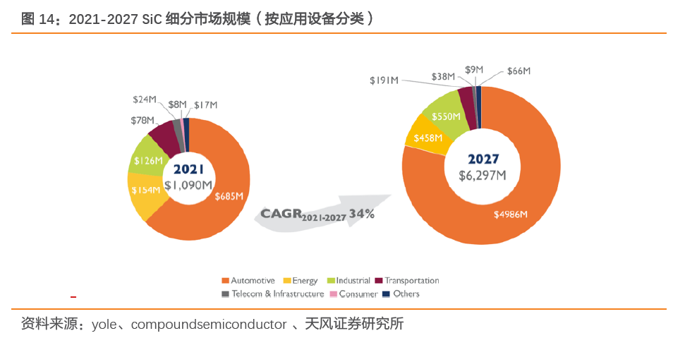 新能源汽车持续渗透+汽车平台高压化带动SiC 器件市场将高速增长。根据Yole数据,2021-2027年,全球 SiC 功率器件市场规模将由10.9亿美元增长到62.97亿美元,CAGR为34%;其中车用SiC市场规模将由6.85亿美元增长到49.86亿美元,CAGR 为39.2%,车(逆变器+OBC+DC/DC转换器)是SiC最大的下游应用,占比由62.8%增长到79.2%,市场份额持续提升。