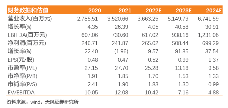 投资建议:预计公司22/23/24年实现归母净利润2.7/5.1/7.0亿元,yoy+10%/92%/38%,23年目标市值130亿元,对应目标价25.4元/股,首次覆盖给予“买入”评级。