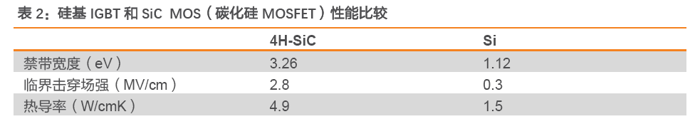SiC在高压+长续航平台有先天性能优势。第三代半导体材料具有禁带宽度大、击穿电场高、热导率高、电子饱和速率高、抗辐射能力强等特点,在高频、高压、高温等工作场景中,有易散热、小体积、低能耗、 高功率等明显优势。相较于硅基器件,SiC器件具有优越的电气性能,如耐高压、耐高温和低损耗。