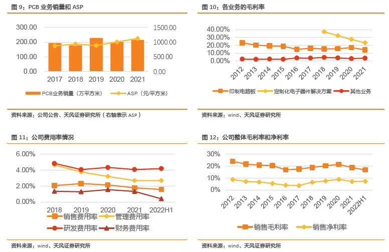 利润整体呈现较高增速发展,21年受原材料涨价盈利能力略有下滑。21年公司实现归母净利润2.42亿元,2017-2021年公司归母净利润CAGR=39%,利润整体呈现高速增长态势。21年公司实现归母净利润同比下滑1.96%,主要是由于上游原材料成本上涨导致的毛利率下滑。2021年,公司销售毛利率下滑2.69pct至18.66%;销售净利率下滑1.8pct至7.06%。分事业部来看,公司解决方案事业部毛利率长期高于PCB事业部,2021年解决方案事业部毛利率为23.22%,PCB事业部毛利率为14.11%。