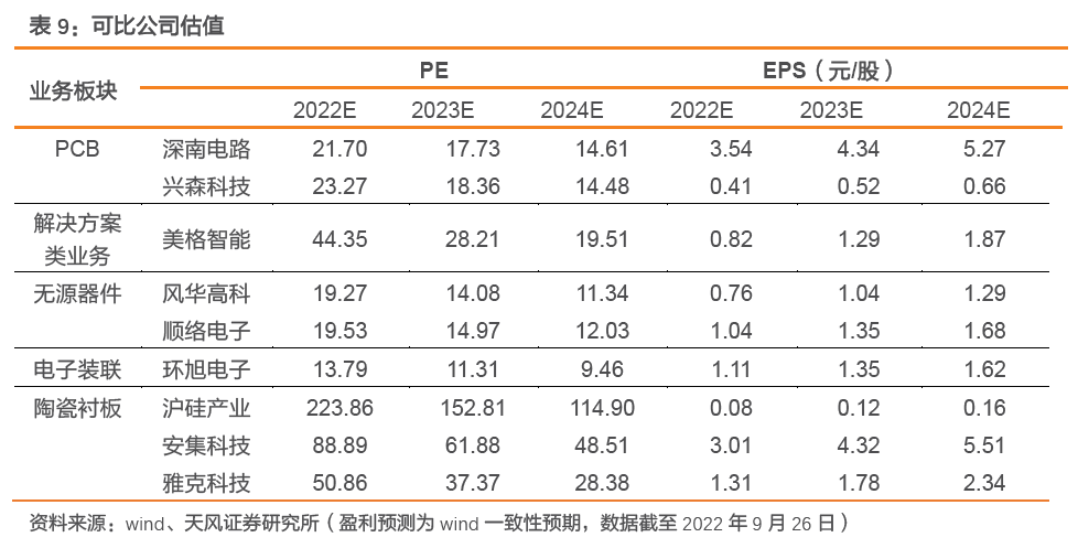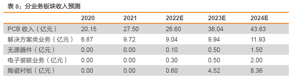 公司为国内稀缺陶瓷衬板+IC载板供应商,有望充分受益于电动化驱动下SiC MOS需求提升+IC载板国产替代进程,持续看好公司产品竞争力+业绩成长性。预计公司22/23/24年分别实现营业收入36.63/51.50/67.42亿元,yoy+4%/41%/31%,预计22/23/24年实现归母净利润2.7/5.1/7.0亿元,yoy+10%/+92%/+38%。我们采取分部估值法对公司进行估值,PCB业务、解决方案类业务、无源器件、电子装联、陶瓷衬板业务分别给予23年18倍、28倍、30倍、15倍、35倍PE,23年目标市值130亿,对应目标价为25.4元/股,首次覆盖给予“买入”评级。