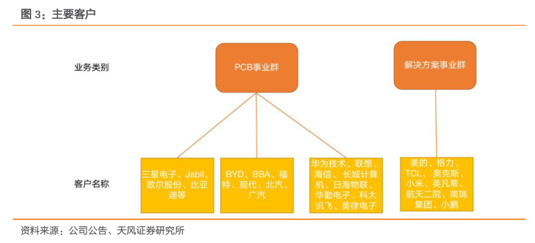 公司在多年经营中积累了丰富优势的客户资源。PCB领域,公司与核心客户三星电子、Jabil、歌尔股份、比亚迪等不断深化合作,进一步拓宽合作领域、拓展合作产品类别;HDI产品和高阶R&F产品进入苹果、华为电声供应链。在汽车电子方面,公司顺利开拓国内新能源汽车龙头企业的同时成功导入了欧美、韩国等汽车行业的第一梯队客户。同时,公司还开拓了行业优质客户包括华为技术、联想、海信、长城计算机、日海物联、华勤电子、科大讯飞和美律电子等。解决方案事业群领域,客户积累了包括美的、格力、TCL、奥克斯、小米、英凡蒂等在内的行业龙头客户,也与造车新势力、航天二院、南瑞集团逐步深入合作。