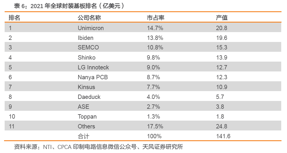 IC载板竞争格局集中,内资厂商市占率低。据NTI统计,从厂商来看,2021年全球封装基板CR10=82.5%、CR3=39%,前三大厂商为中国台湾欣兴(Unimicron)、日本 Ibiden、韩国 SEMCO,分别市占率为15%、14%、11%。从产地来看,封装基本的主要生产地为中国台湾、日本、韩国,分别为31%、20%、28%,中国产值为16%,然而中国产值里面包括了外资以及内资在中国生产的封装基板的产值,在国内的外资企业如台资的昆山南亚/苏州欣兴/苏州景硕、港资美龙翔/安捷利电子、奥地利奥特斯,内资IC载板厂商主要有兴森科技、深南电路、珠海越亚、丹邦科技、东莞康源电子、普诺威电子(崇达技术参股公司),来自于内资企业封装基板产值约为 5.4 亿美元,全球占比为 5.3%。