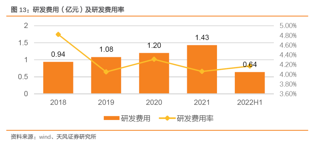 管理费用率稳步大幅下降,销售费用率和财务费用率均保持相对稳定。2021年公司研发费用率保持相对稳定,管理费用率下降0.54pct至2.66%,销售费用率下降0.34pct至1.77%。财务费用率下降0.23pct至1.32%。