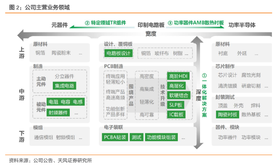 国内领先PCB供应商、稀缺AMB陶瓷基板供应商,内生外延成长为“PCB+元器件+解决方案”一站式解决方案提供商。公司成立于2005年,2015年上市。公司主要产品为PCB(单/双面板、多层板、HDI),产品下游应用领域广泛,涵盖消费电子、通讯设备、汽车电子、工控设备、医疗电子、智能安防及清洁能源等领域。公司典型客户包括百富计算机、沃特沃德、三星电子、格力电器、比亚迪、新大陆电脑、伊顿电气、新国都、华智融和瑞斯康达等行业内知名企业。