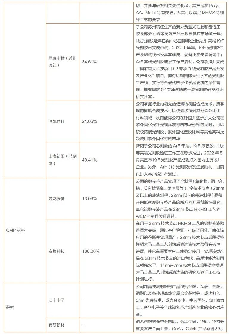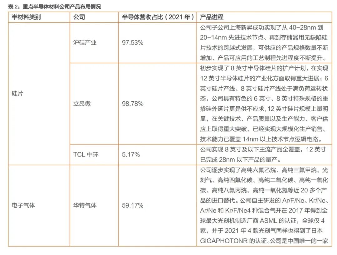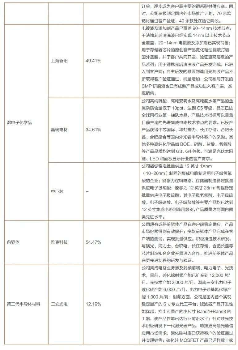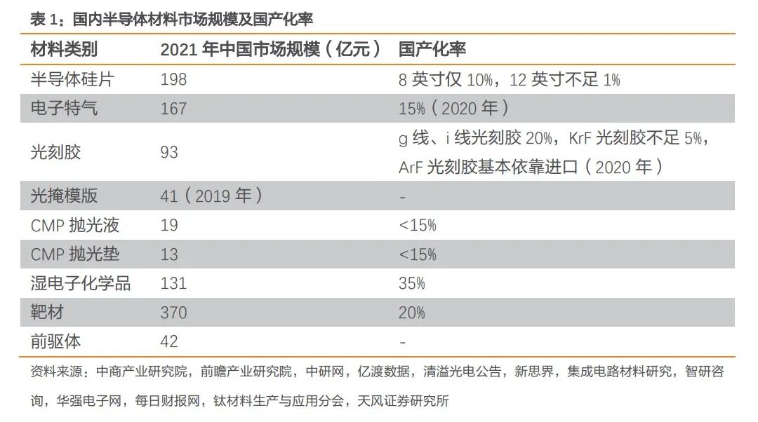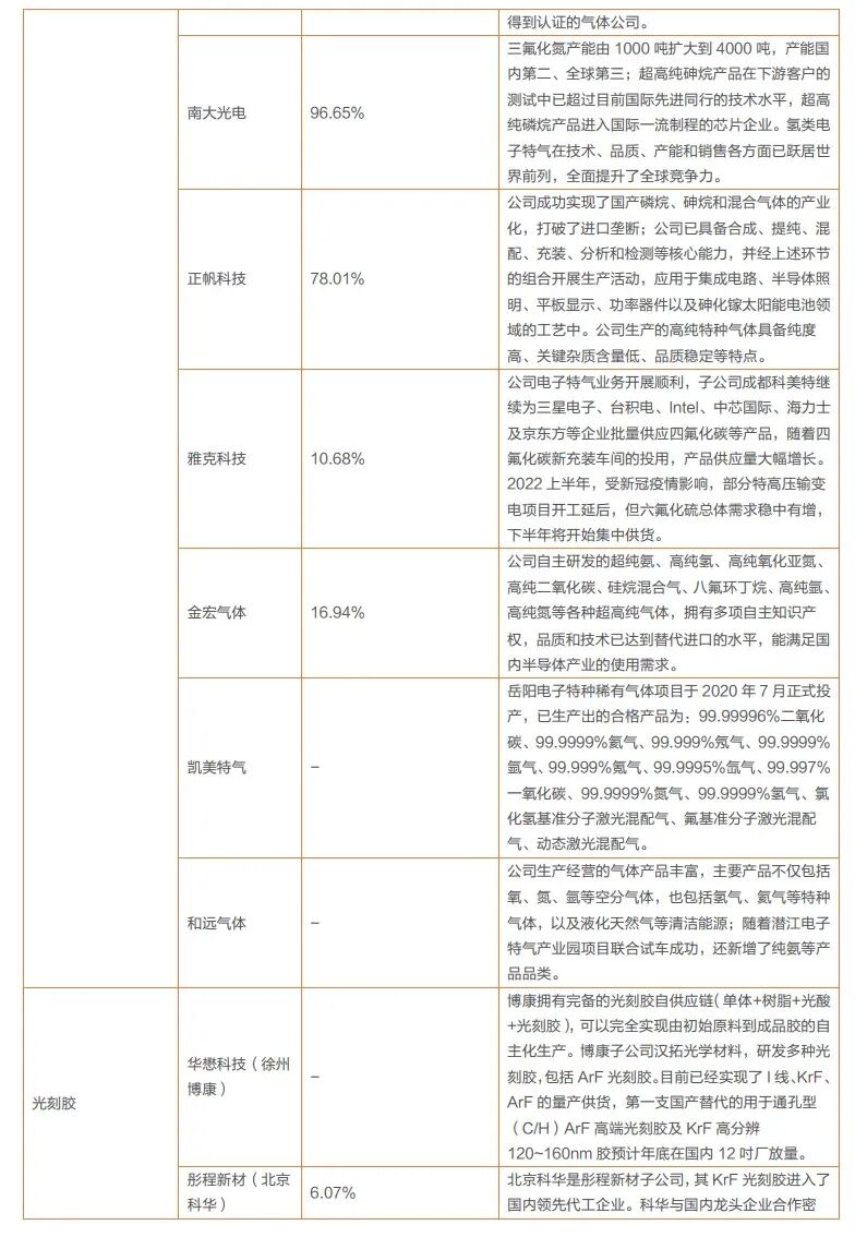 我国前端晶圆制造材料核心优势仍然不足,大部分材料的国产替代率都在15%以下。我们认为,随着美国对中国半导体产业限制的增加,对原材料的进口替代速度或将加快,国产晶圆制造材料占比有望不断提升。