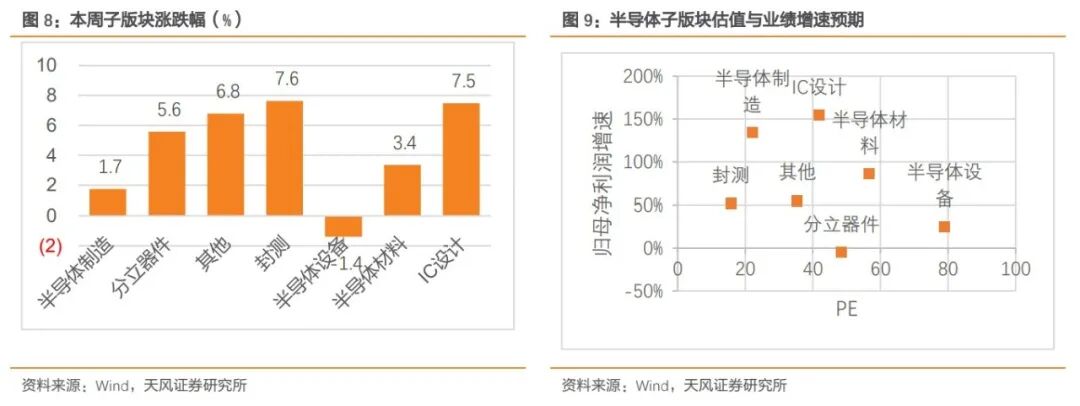 半导体各细分板块大部分上涨。半导体细分板块中,封测板块本周上涨7.6%,IC设计板块本周上涨7.5%,分立器件板块本周上涨5.6%,半导体材料板块本周上涨3.4%,半导体制造板块本周上涨1.7%,半导体设备板块本周下跌1.4%,其他板块本周上涨6.8%。