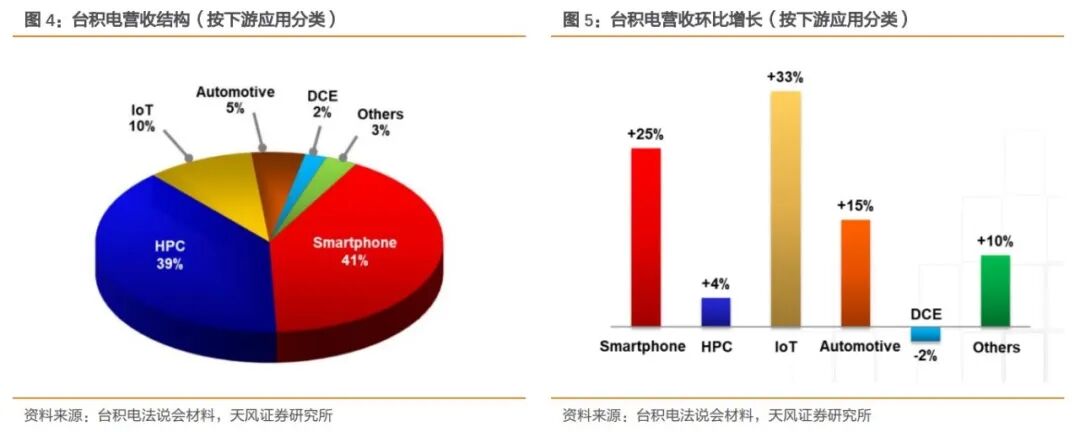 按下游应用分类,智能手机占Q3总营收比例为41%,环比增长25%;HPC占比39%,环比增长4%。IoT占比10%,环比增长33%;汽车占比5%,环比增长15%;DCE占比2%,环比下降2%。