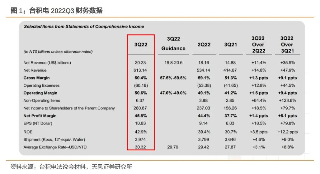 台积电10月13日召开法说会,从披露的2022Q3财务数据来看,多项指标创新高。其中,2022Q3营收为202.3亿美元,同比增长35.9%,环比增长11.4%,主要受到领先的5nm技术的强劲需求的驱动。毛利率为60.4%,同比增加9.1个pct,环比增加1.3个pct,均高于预期,主要是受到有利汇率及成本改善的影响。