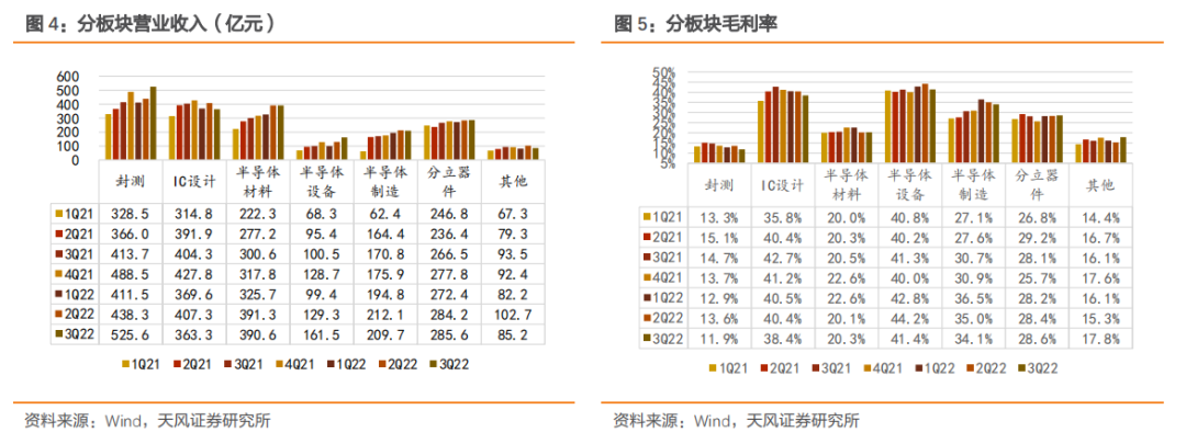 A股半导体3Q22营收同比增长14%,增速相较于2Q22下滑。细分板块来看,3Q22封测板块营收同比增长27%,增速环比提升;IC设计板块营收同比下滑10%,主要由于2022年三季度的高基数导致;半导体材料板块营收同比增长30%;半导体设备板块营收同比增长61%,增速环比提升;半导体制造板块营收同比增长23%;分立器件板块营收同比下滑2%。