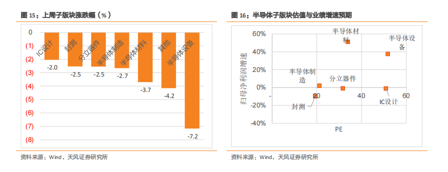 半导体各细分板块中半导体设备板块跌幅明显。半导体细分板块中,IC设计板块下跌2.0%,封测板块下跌2.5%,分立器件板块下跌2.5%,半导体制造板块下跌2.7%,半导体材料板块下跌3.7%,半导体设备板块下跌7.2%。