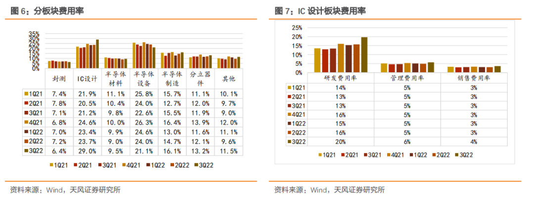 设计板块毛利率略有下降,体现了三季度IC产品的价格压力。细分板块看,三季度封测板块毛利率达到11.9%,环比下滑;IC设计板块毛利率38.4%,环比下滑;半导体材料板块毛利率20.3%,环比基本持平;半导体设备板块毛利率41.4%;半导体制造板块毛利率34.1%。
