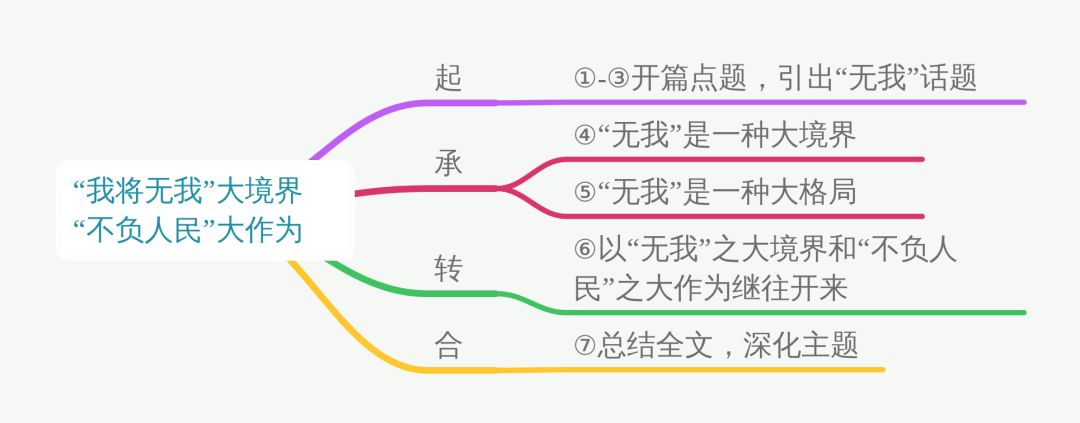 ⑤大格局成就大作为。“无我”是一种大格局,是夙夜在公、勤勉工作,是立党为公、执政为民。从“我们追求的发展是造福人民的发展”的自我要求,到“得罪千百人,不负十三亿”的责任担当,再到“人民是我们执政的最大底气”的庄严宣示,无不彰显着枝叶关情、人民至上的远大格局。有了这种格局,才能诚心诚意为民、公平公正惠民,引领着全党全国各族人民追梦圆梦的壮阔征程。(“无我”是一种大格局,大格局成就大作为。)