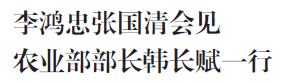 市委书记李鸿忠,市委副书记、市长张国清昨晚在迎宾馆会见农业部党组书记、部长韩长赋一行。李鸿忠希望双方深化部市合作,加快推进现代都市型农业发展,推动天津质量兴农、绿色兴农、品牌强农步伐。农业部领导余欣荣、张合成,市领导李毅、李树起和市政府秘书长孟庆松参加。(记者 于春沣 魏彧)