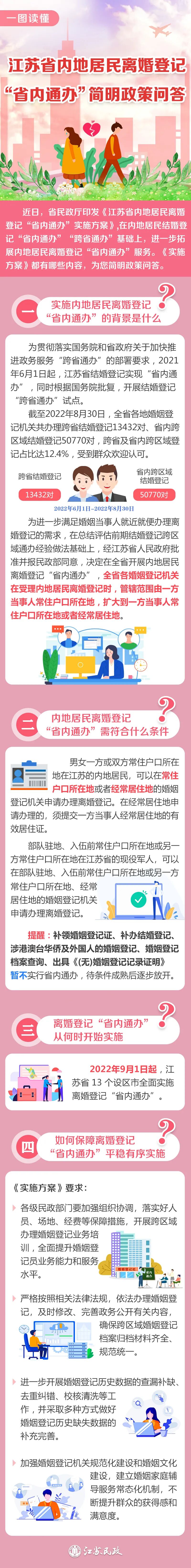 近日,省民政厅印发《江苏省内地居民离婚登记“省内通办”实施方案》,在内地居民结婚登记“省内通办”“跨省通办”基础上,进一步拓展内地居民离婚登记“省内通办”服务,决定自2022 年 9 月1日起,江苏省各婚姻登记机关在受理内地居民离婚登记时,管辖范围由一方当事人常住户口所在地,扩大到一方当事人常住户口所在地或者经常居住地。