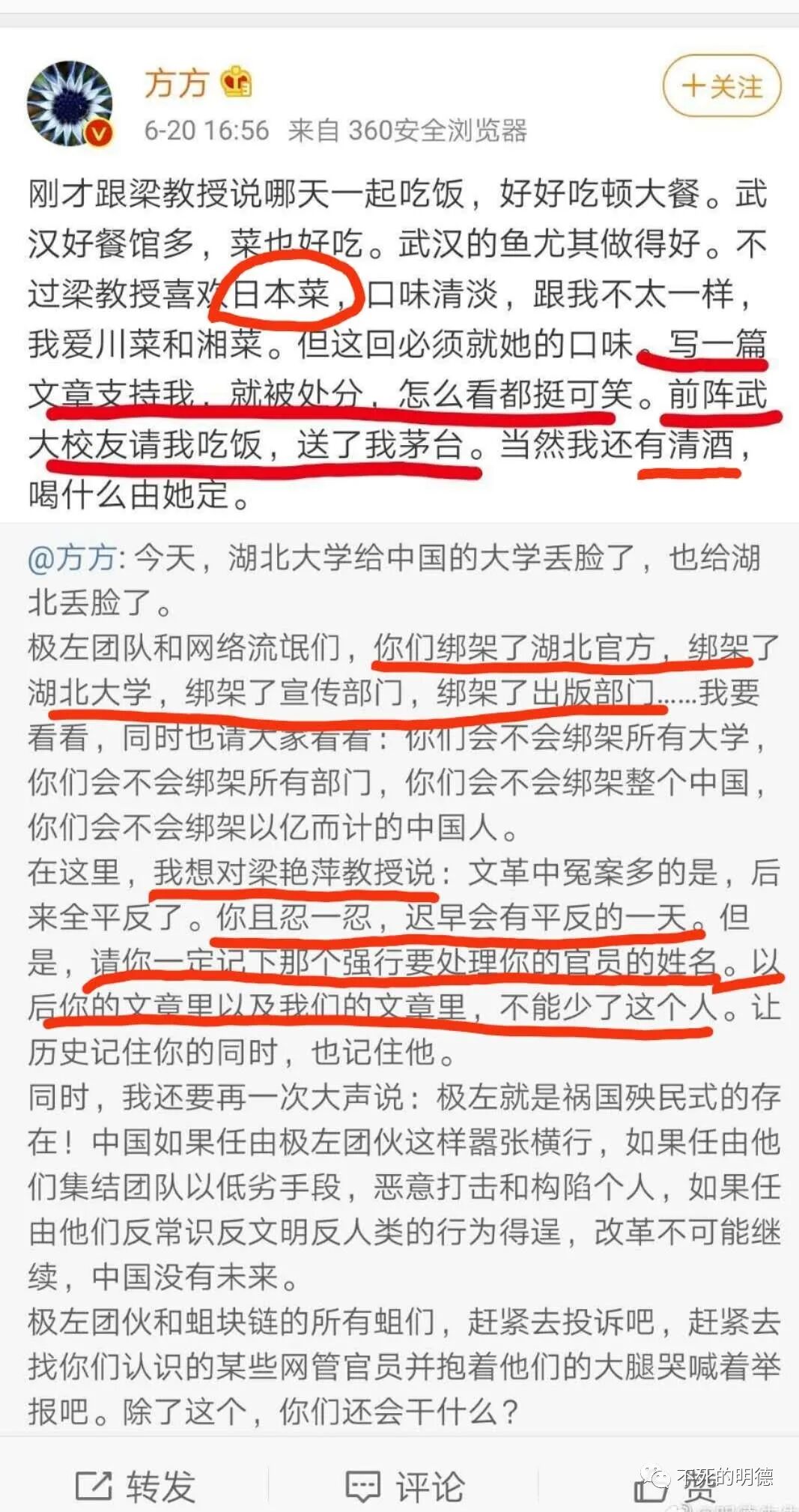 尤其是,今天,湖北大学依法依规处理了该校力挺港独、台独、精日的文学院教授梁艳萍,本是皆大欢喜的事情,汪芳竟然再一次站出来力挺梁艳萍,公开为之张目、打气,叫嚣着要对湖北大学处理此事的同志进行清算!