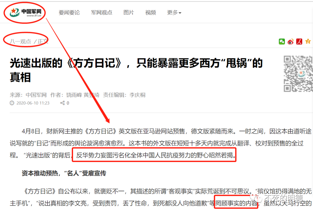 铁主席,如果这般劝说还不管用,请您读一读“中国军网”这篇点名批评方方日记、并将其定性为“反华”的文章吧: