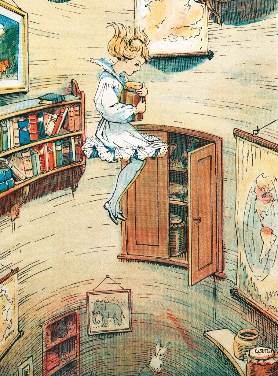 ▲在每个人的童年时光里,也许都幻想着经历一次《爱丽丝漫游奇境》中的奇幻冒险。在W.H.沃克为1970年版《爱丽丝漫游奇境》绘制的插图里,爱丽丝跟在白兔后面,掉进了地下世界。