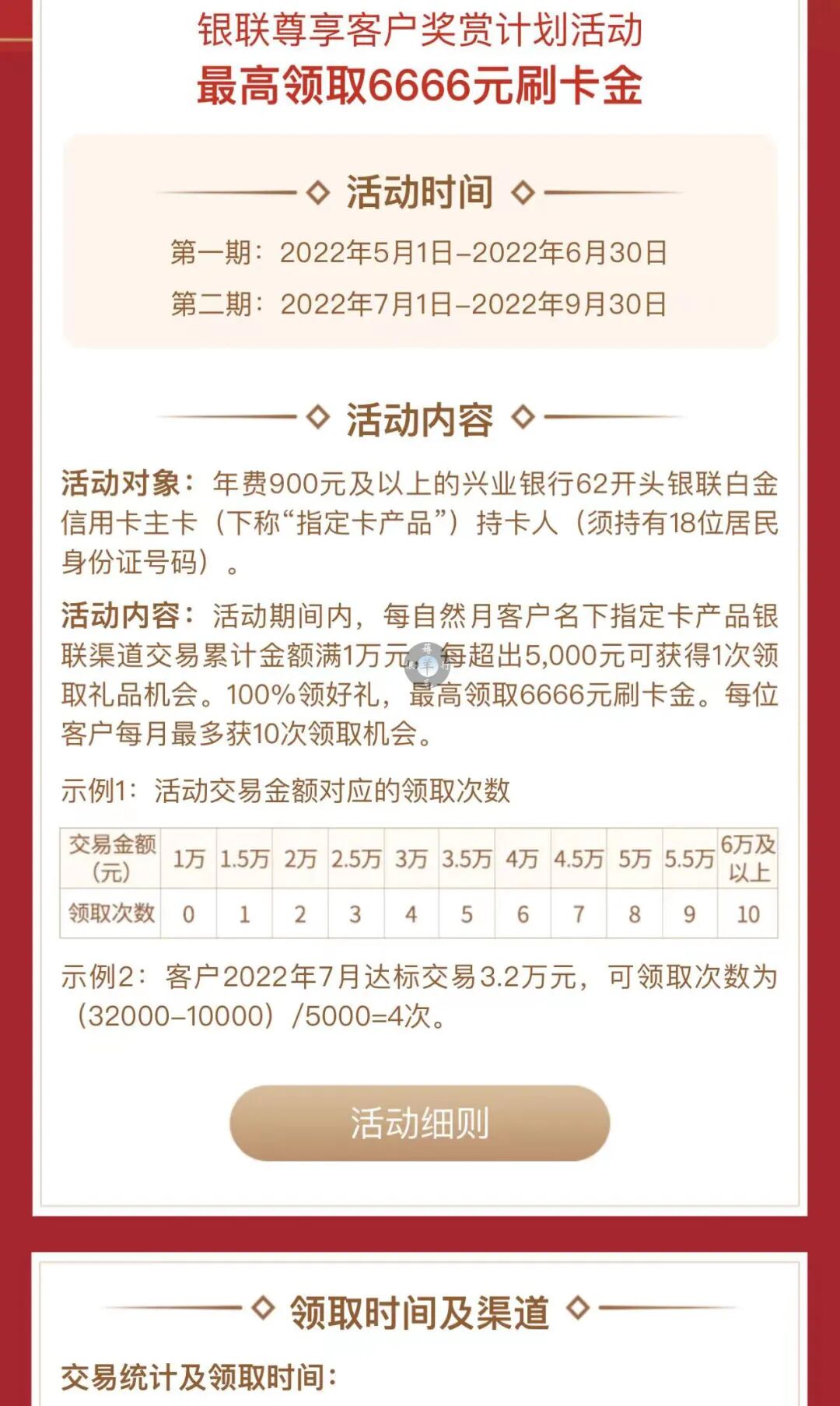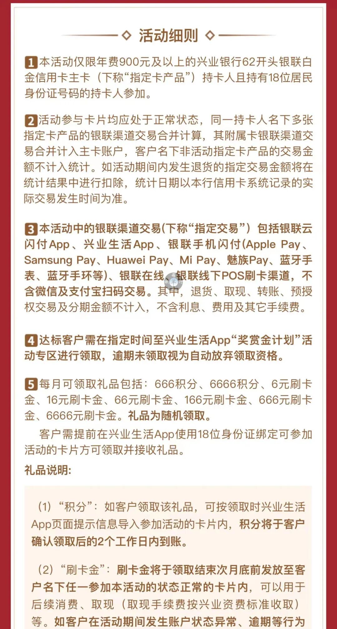 年费900元及以上白金卡,每月,银联渠道累计消费满1万元,每超出5000元,次月21日随机抽:6-6666元刷卡金、666/6666积分,月限10次(消费6万)