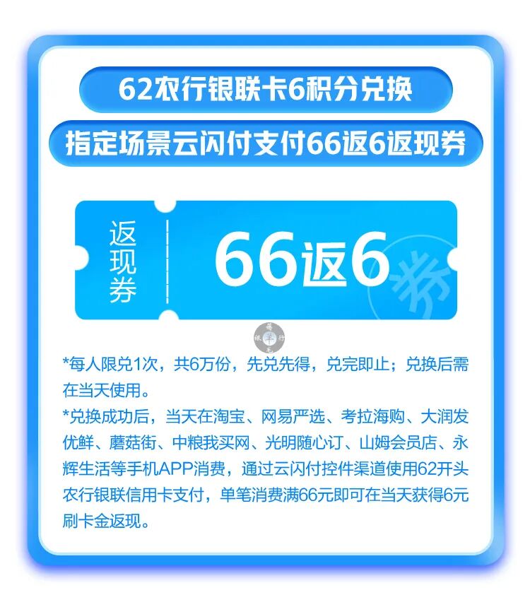 3、8月6日9点,6积分报名,淘宝/永辉生活/山姆会员店/严选/考拉/大润发优鲜/蘑菇街,云闪付消费满66返6元,限1次,2万报名名额