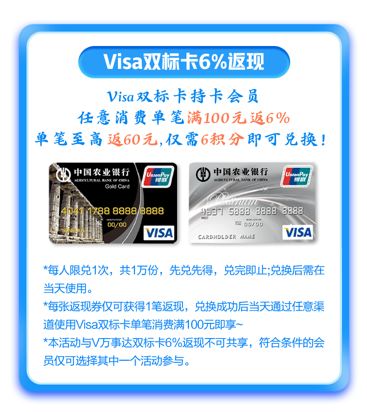 4、8月6日9点,6积分报名,万事达/VISA双标卡,6积分报名,微信消费返现6%(60元封顶),共限1次,各1万报名名额